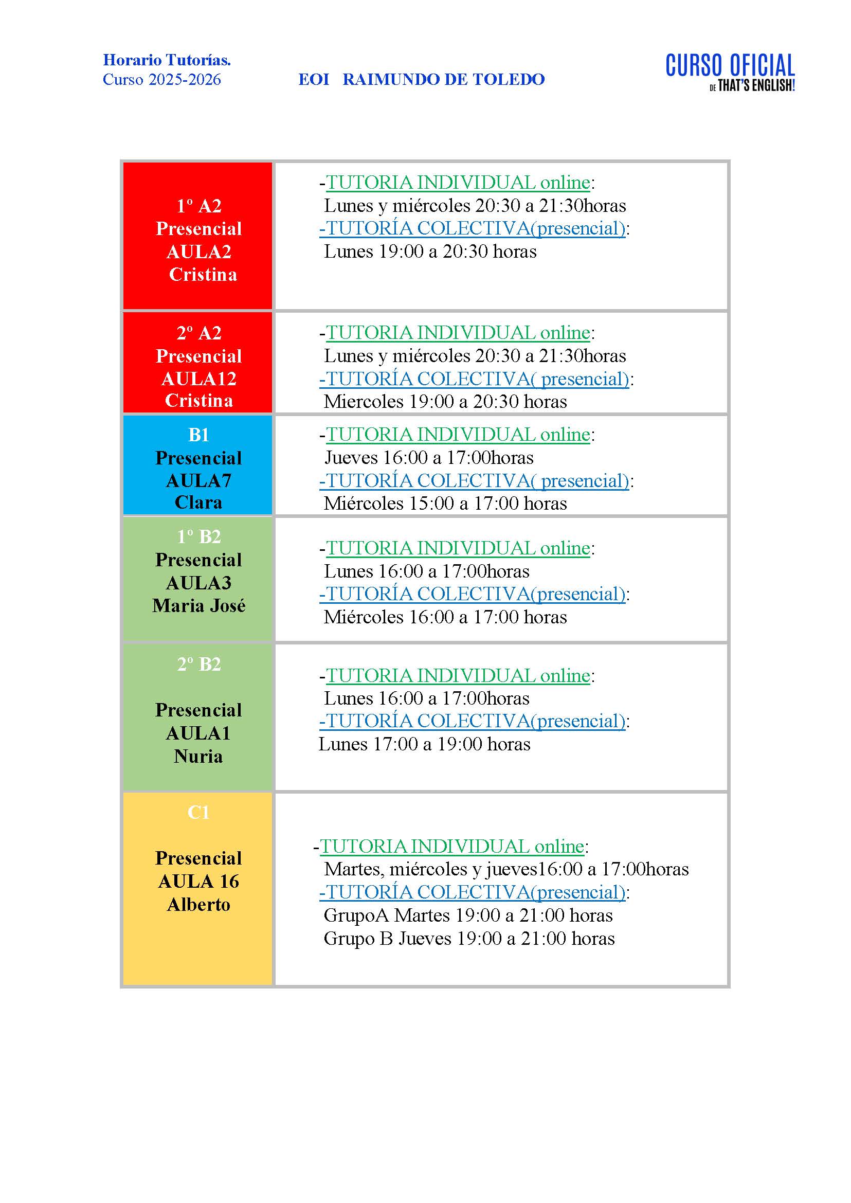 EOI Raimundo de Toledo: HORARIO DE TUTORÍAS